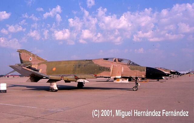 Foto : Michel Klaver En concreto este es uno de los primeros Phantom españoles, fue entregado el 27 de Julio de 1972 y dado de baja el 20 de Febrero de 1989. Aqui le vemos con su camuflaje SEA (Sur Este Asiático) en perfecto estado. |