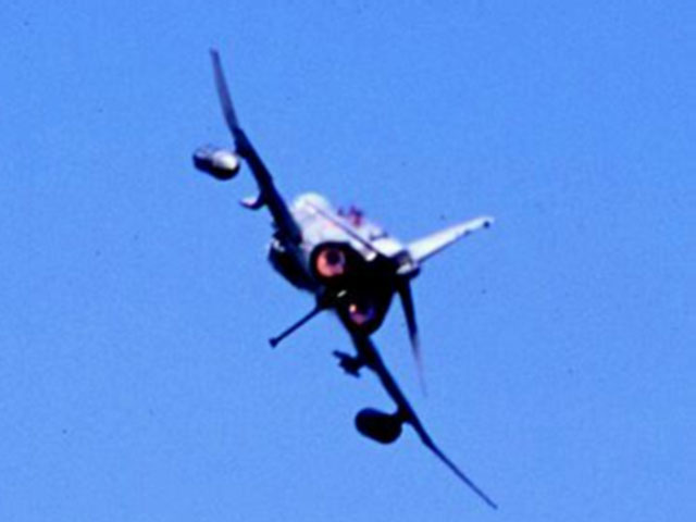 Foto J.A. Cifuentes Tras la pasada lenta el CR.12-46/12-55 mete el postquemador para no caerse en un viraje en los limites de la sustentación. 17/06/01 |