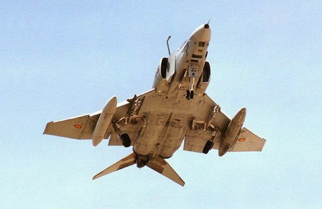 Foto J.A. Cifuentes Replegando los trenes tras el despegue, podemos observar la disposición del lanzador LAU-7A que permiten montar 2 misiles Sidewinder AIM-9L. 3 de Abril del 2000. Los Llanos, Albacete |