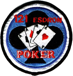 En la primavera de 1986 se creo este nuevo emblema para el 121 escuadrón, en el se refleja su indicativo de radio "POKER". Los EF-18 lo han heredado y sus pilotos lo lucen en sus monos de vuelo.