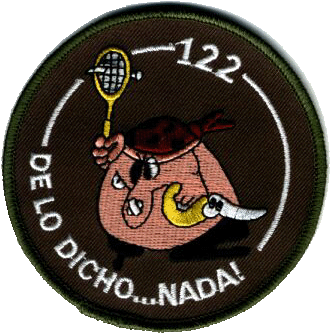 El escudo del 122 escuadrón data de 1986 y refleja por un lado su indicativo de radio "TENIS", de hay la raqueta y el pirata, por la afición de sus pilotos por el vuelo a baja altura.(Piratear en jerga aeronáutica). Al igual que el emblema del 121, este también se mantiene en los actuales EF-18 "Hornet" (Nuestros "avispones".)